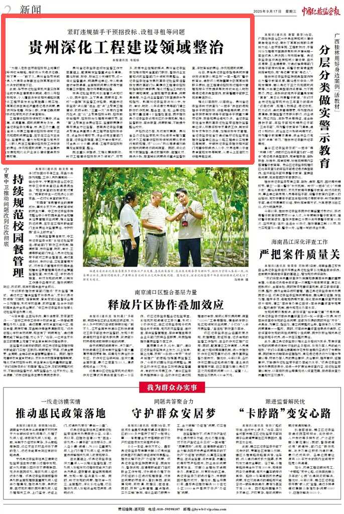 既注重纵深推进,又强化横向联动。针对工程建设招投标涉及领域广、环节多、政策专业性强的特点,贵州省纪委监委加强与相关省直部门联动,督促行业主管和行政监督部门分领域开展整治。省纪委监委驻省发展改革委纪检监察组督促发展改革部门认真履行工程建设招投标指导和协调职责,强化对整治工作的统筹协调和调度,全面梳理项目清单、问题清单等,为各行业监督部门核查提供参考和指引。黔南州纪委监委与州公安、发改、审计、财政、公共资源交易等部门建立联动协作机制,整合室、组、地、企等纪检监察力量组建4个监督检查组,同步推动县级纪委监委运用片区协作等机制,强化监督联动、案件联查、问题联解,不断提升整治成效。